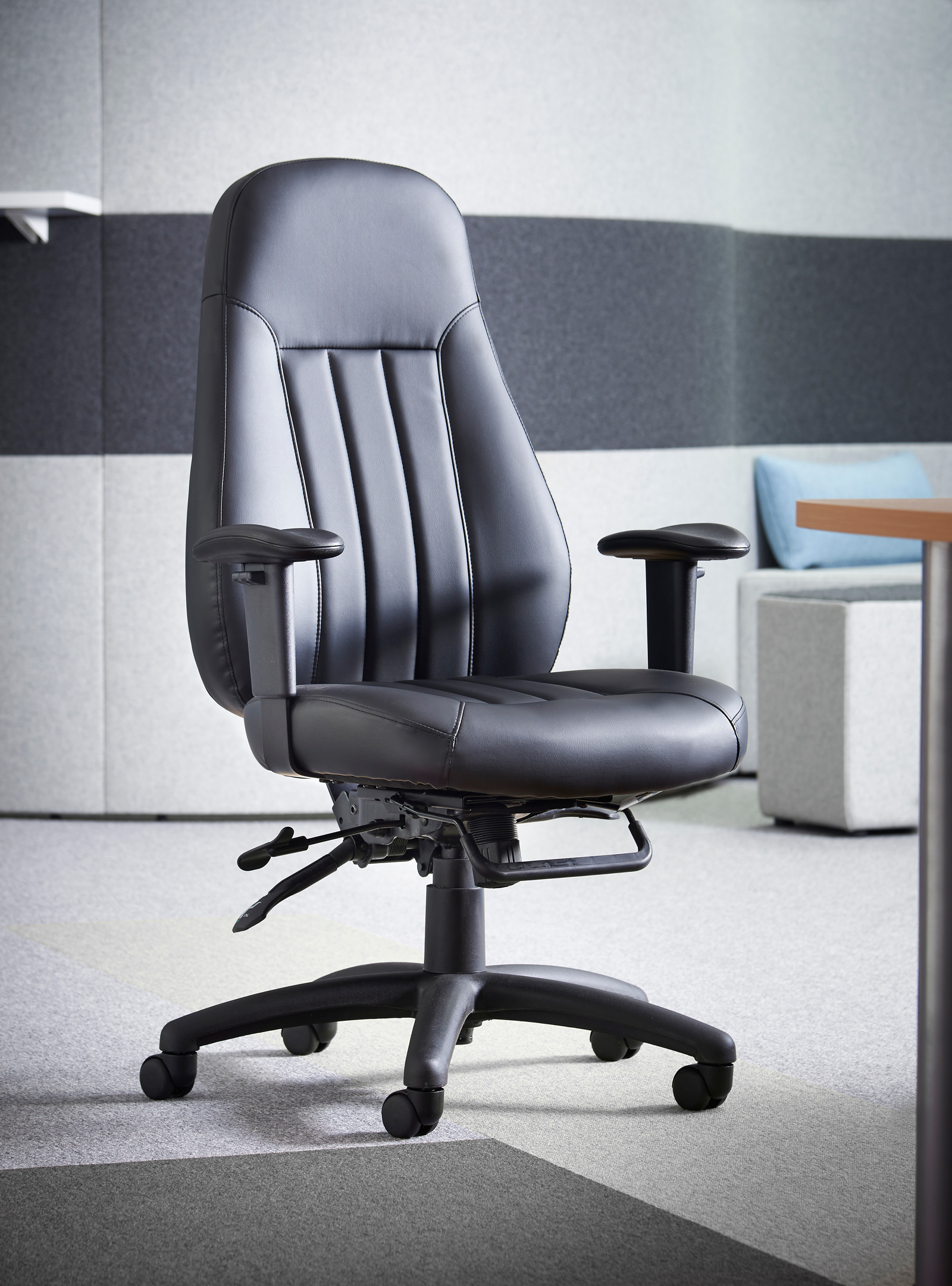 Zeus is a dual purpose chair which is designed for both style conscious executives and for challenging 24 hour environments that require added comfort and durability. Available in black faux leather high back and medium back, and with blue or black fabric, Zeus has a triple paddle multi-functional mechanism and represents the executive standard in seating.